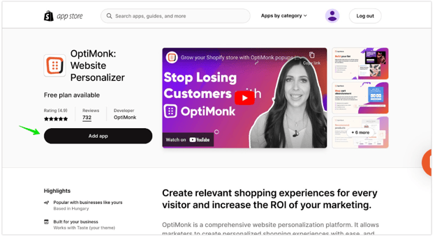 - 1.1 Visita la pagina dell'app OptiMonk nel negozio Shopify e fai clic sul pulsante Aggiungi app per installare OptiMonk sul tuo sito Shopify