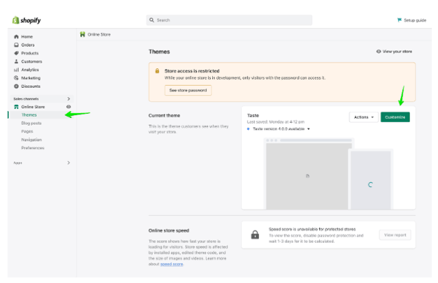 Abilita l'incorporamento dell'app OptiMonk nel tuo tema Shopify - 2.1 L'ultimo passaggio è abilitare la modalità di incorporamento dell'app Shopify per l'app OptiMonk nel tuo negozio Shopify. Per farlo, vai alla sezione Temi nel tuo negozio Shopify e fai clic su Personalizza.