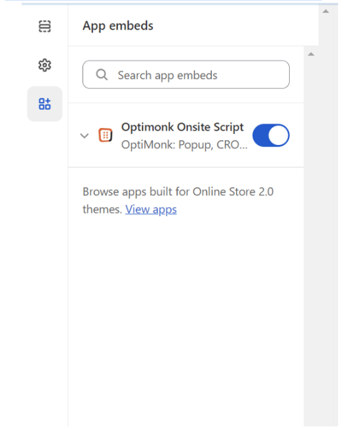 - 2.2 Seleziona la scheda Incorporamento app e attiva l'interruttore OptiMonk.